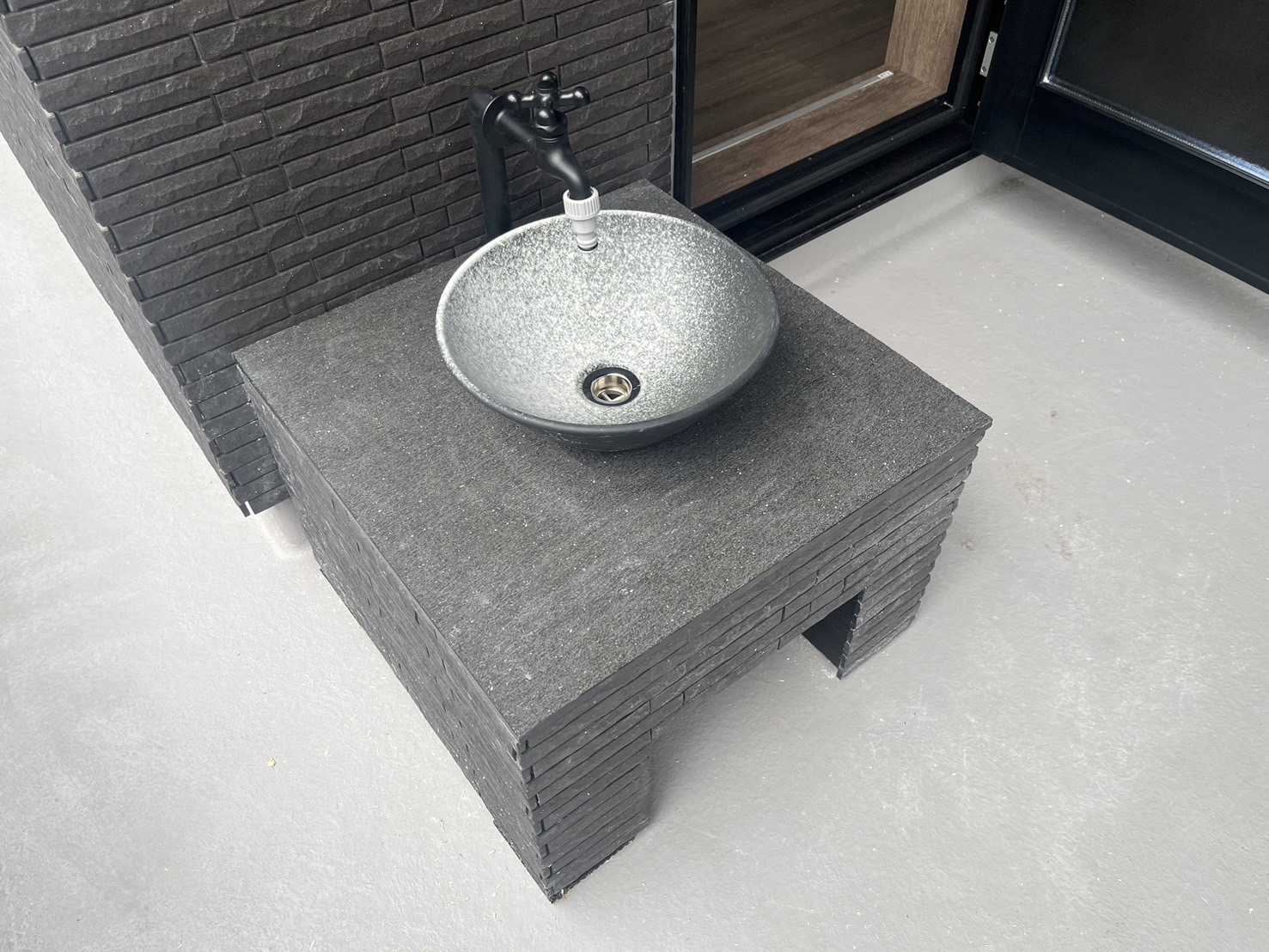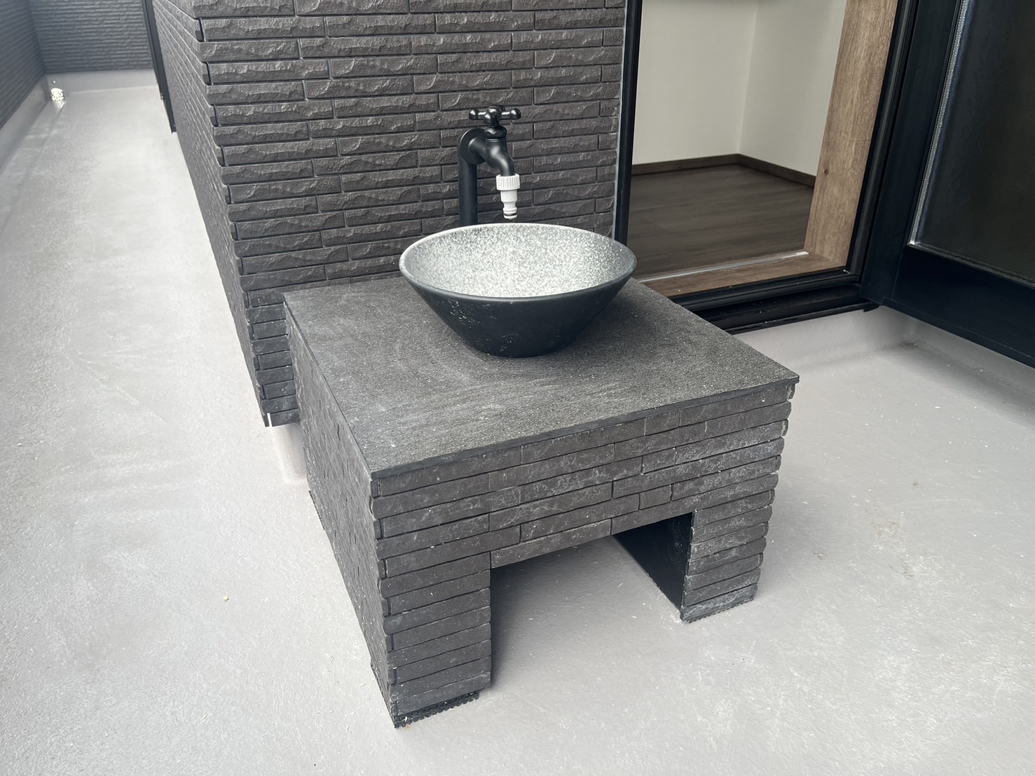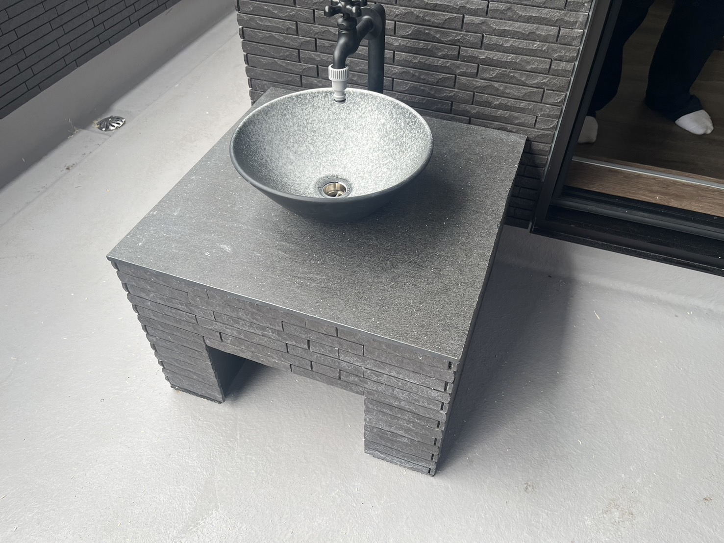 特注 外部手洗い製作 設置 担当:高橋直仁 After 君津市 M様 バルコニーに外部用手洗いを製作、設置しました。 ●拘りPOINTとして、建物本体の外壁タイルと同化するよう、側面に同じタイル、また天板は類似色の床タイルを貼って仕上げました。 ※しっかり、バルコニーの勾配に合わせ左右の高さを変えて水平にもしてありますよ!